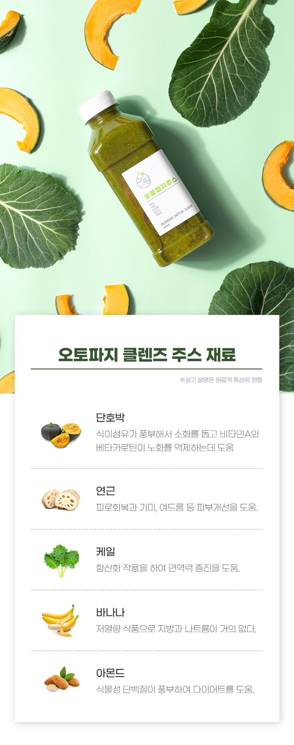 단호박(뉴질랜드산)21%, 바나나(필리핀산)21%, 유기농케일(국내산)14%, 연근(국내산)11%, 아몬드(미국산)2%, 정제수 31%