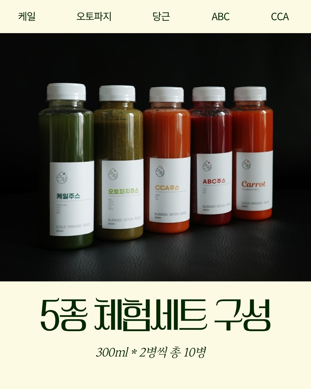 케일·당근·CCA·ABC·오토파지 주스 300ml 각 2병씩 총 10병으로 구성되어 있습니다.